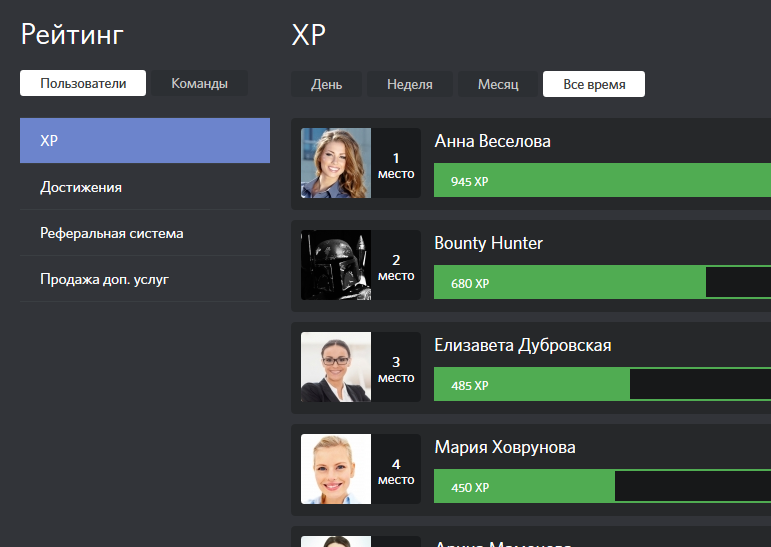 Таблицы лидеров, показывающие самых активных и успешных пользователей платформы за разные периоды, с автоматическим вознаграждением победителей.